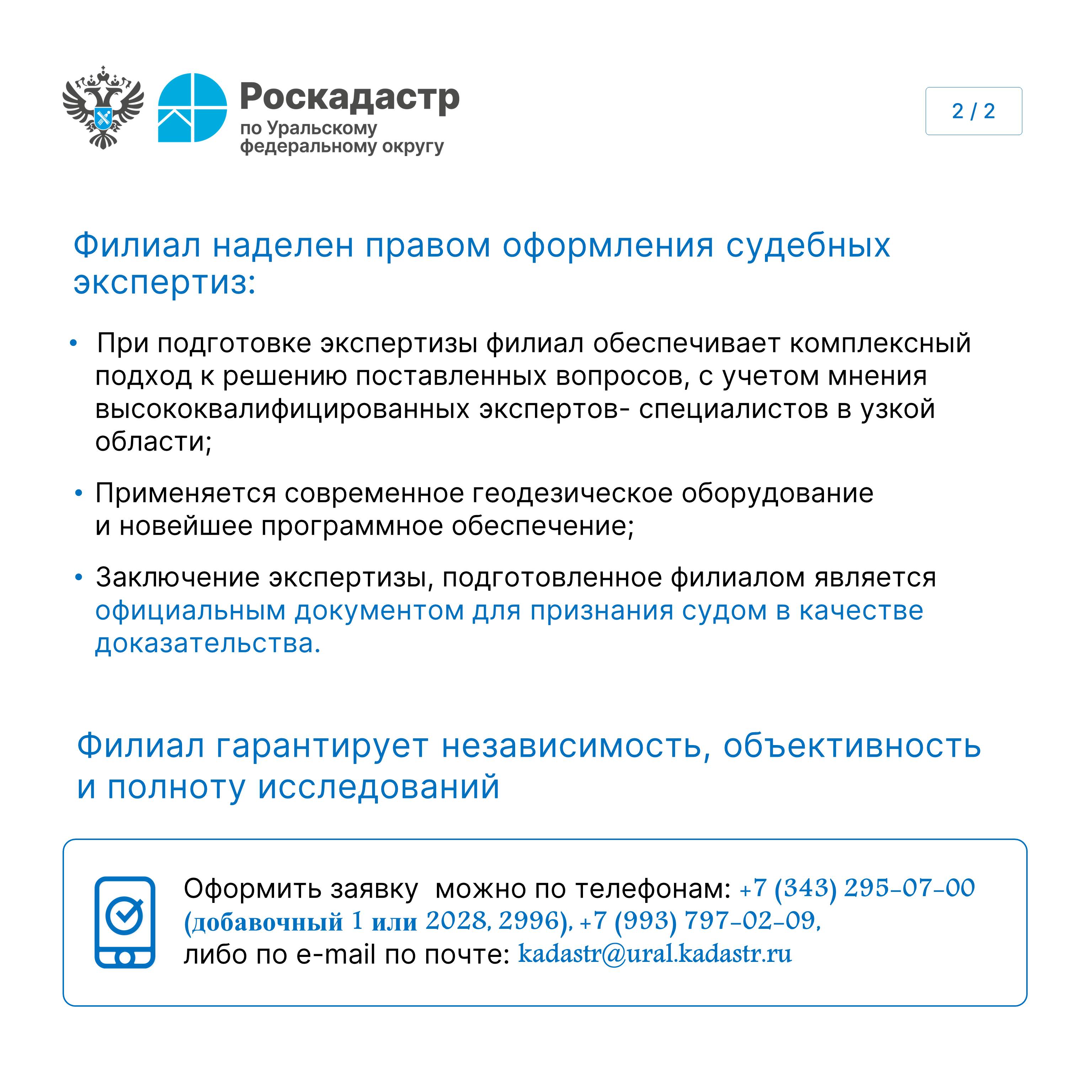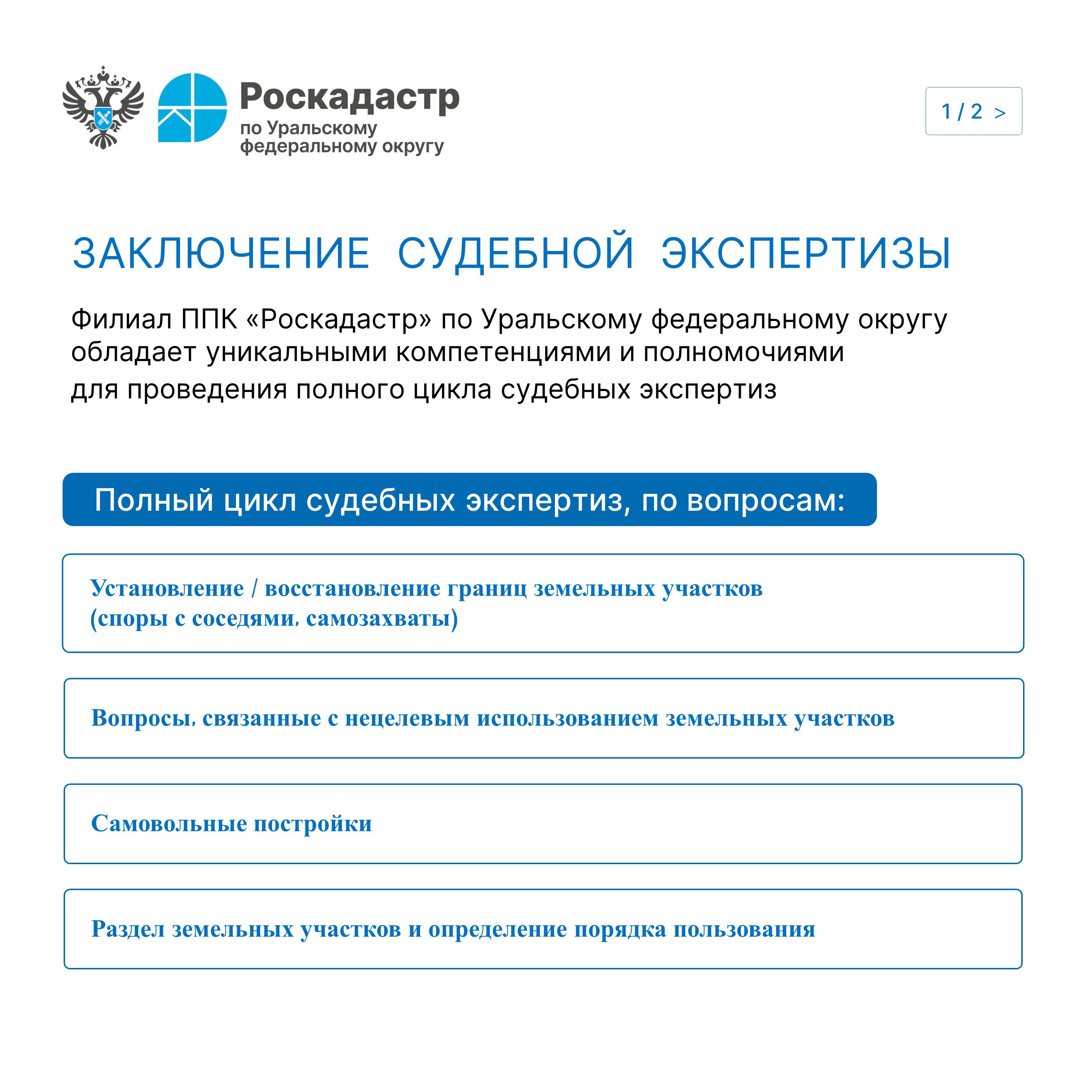 Филиал ППК «Роскадастр» по Уральскому федеральному округу обладает уникальными компетенциями и полномочиями для проведения полного цикла судебных экспертиз.