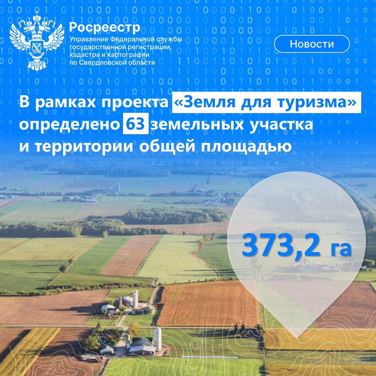 В Свердловской области с 2022 года в рамках федерального проекта «Земля для туризма» определено 63 земельных участка и территории общей площадью 373,2 гектара. Также определены 48 объектов туристического интереса.