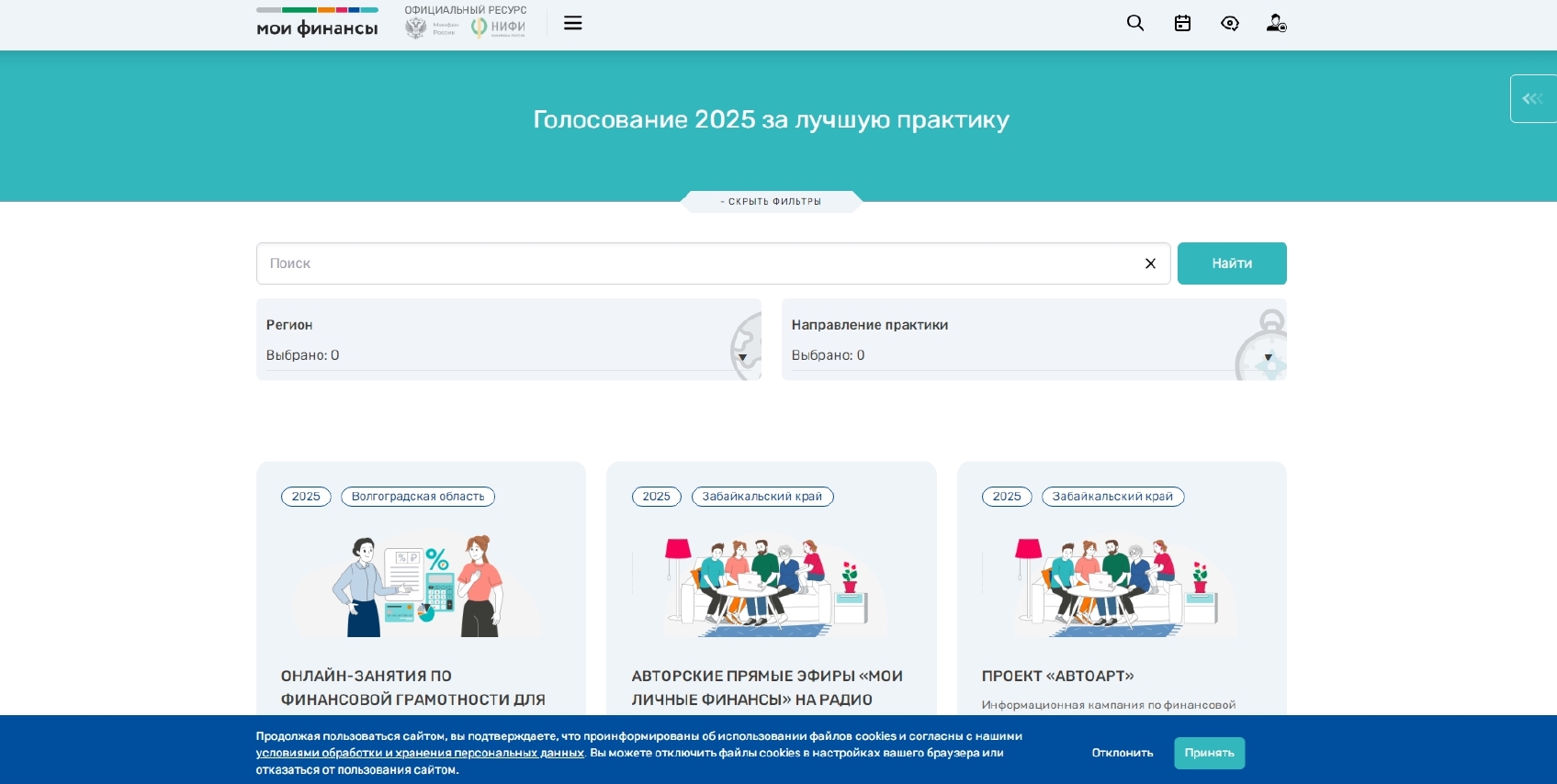В голосовании принимают участие практики, представленные региональными органами исполнительной власти субъектов Российской Федерации, ответственными за реализациюпрограмм по финансовой грамотности, в "Каталог лучших региональных практик 2025".