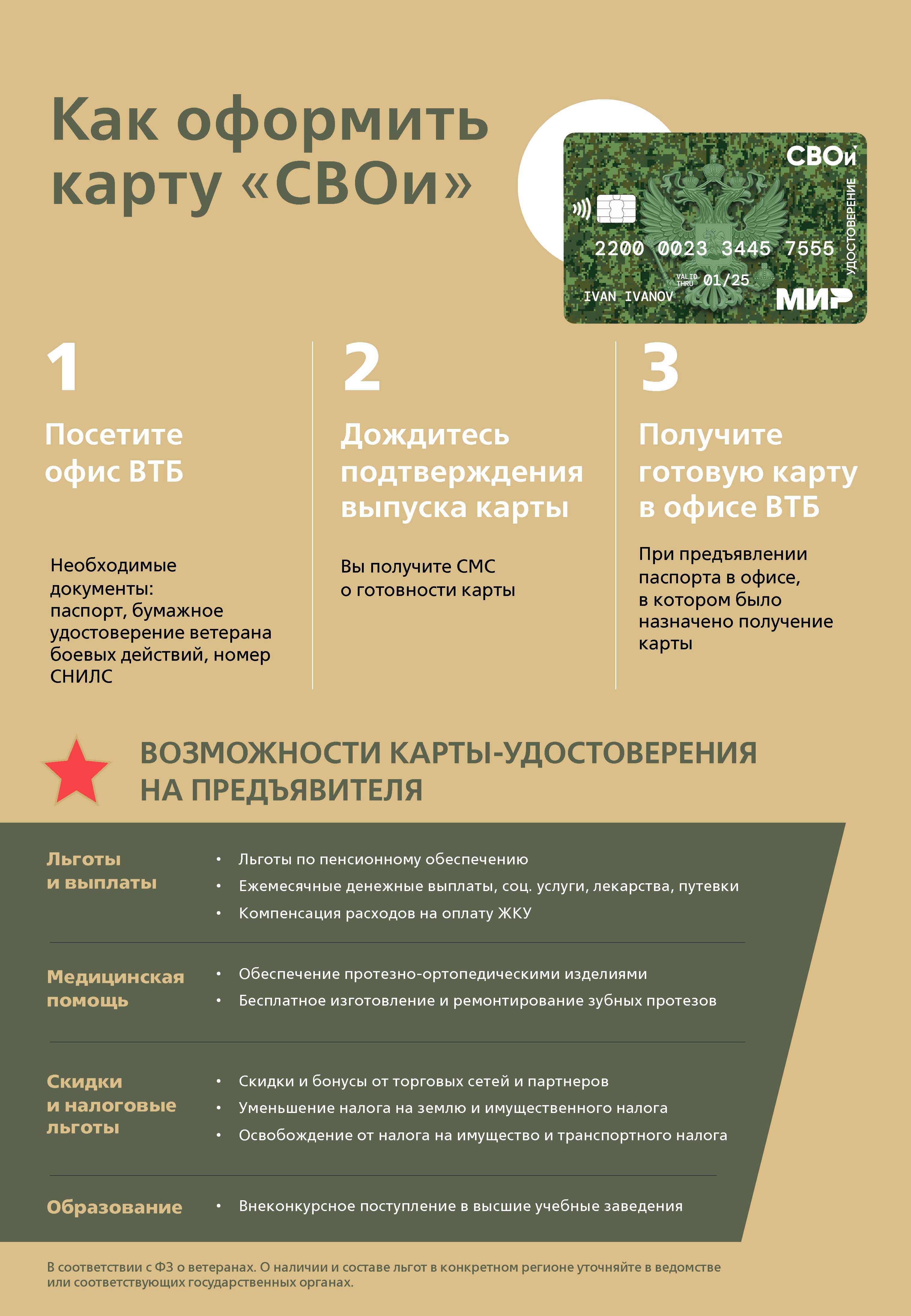 С марта 2024 года по инициативе Министерства обороны в России начался выпуск электронной карты-удостоверения ветерана боевых действий «СВОи». Это многофункциональный продукт, который одновременно служит ветеранским удостоверением, социальной и банковской картой. Он действует наравне с бумажным документом, но предоставляет владельцу больше возможностей. Карточка подходит для расчетов, снятия наличных в банкоматах, получения денежного довольствия и льгот.