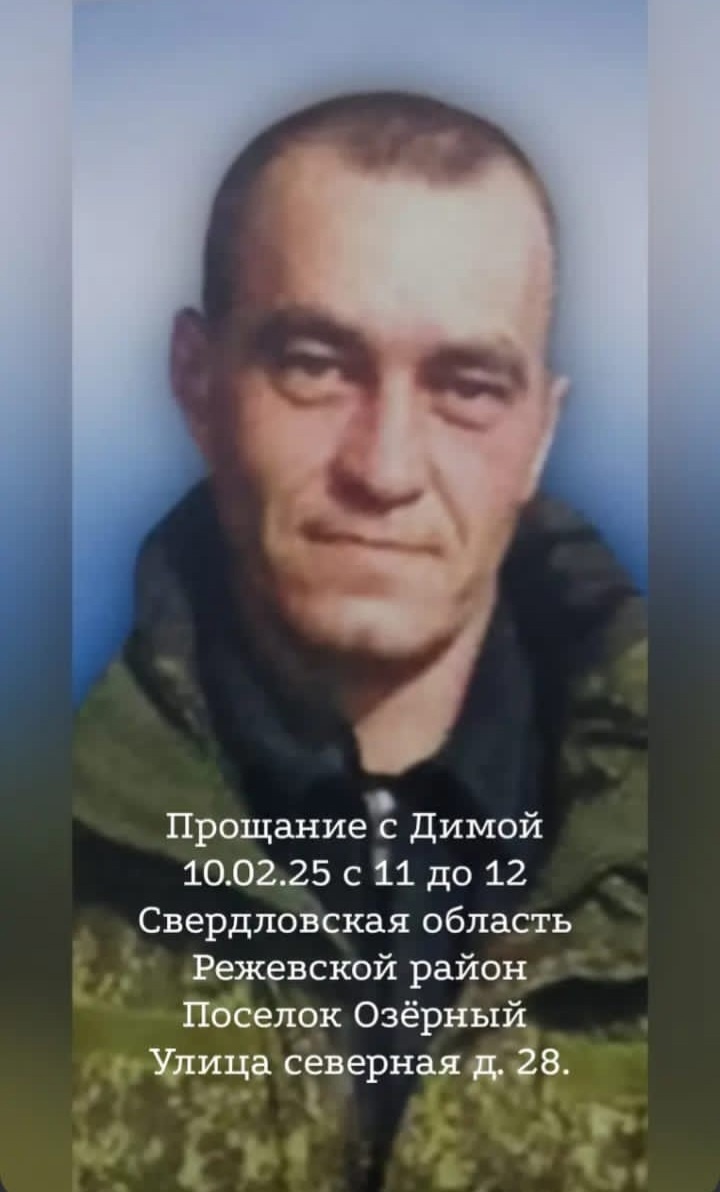 Прощание с Димой состоится 10.02.2025 в 11:00 по адресу: Свердловская область, Режевской район, п. Озёрный, ул. Северная, д. 28.