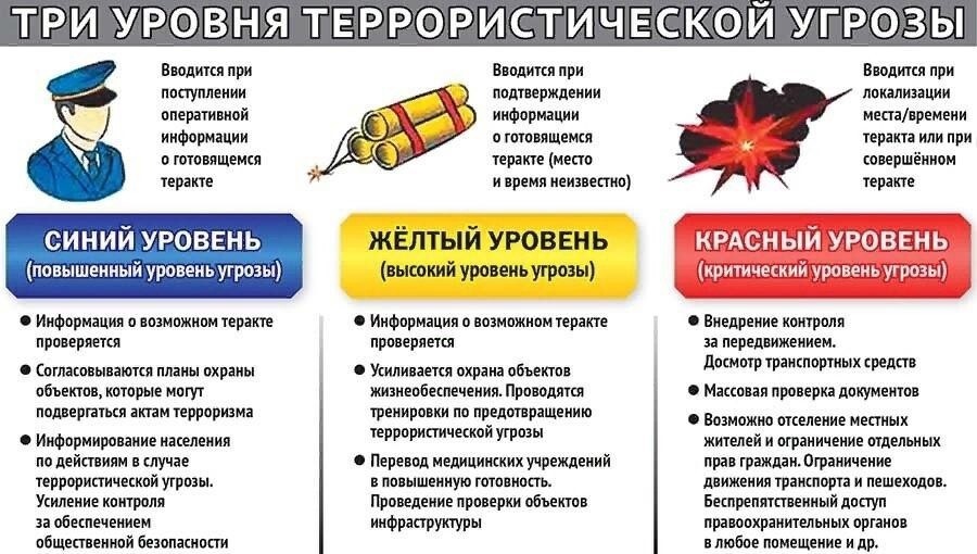 Уровни террористической опасности в России обозначаются синим, жёлтым и красным цветами: