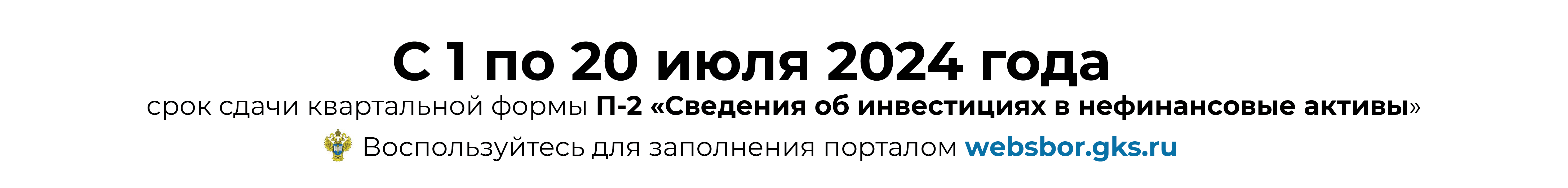 С 1 по 20 июля 2024 года необходимо направить квартальную форму федерального статистического наблюдения № П-2 «Сведения об инвестициях в нефинансовые активы» через портал http://websbor.gks.ru.