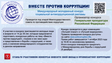 Генеральной прокуратурой РФ проводится Международный молодежный конкурс антикоррупционной рекламы "Вместе против коррупции!". Станьте участником конкурса, внесите свой вклад в профилактику коррупции.